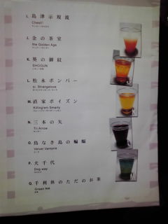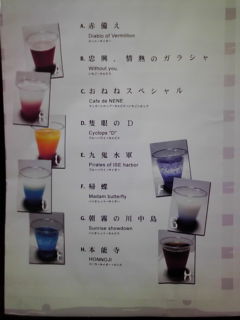 企画の純喫茶(!!!!)「カフェ ド ねね」で出された戦国カクテルジュース「黄金の茶室」(笑)。12種類くらいあって選べるですよー。